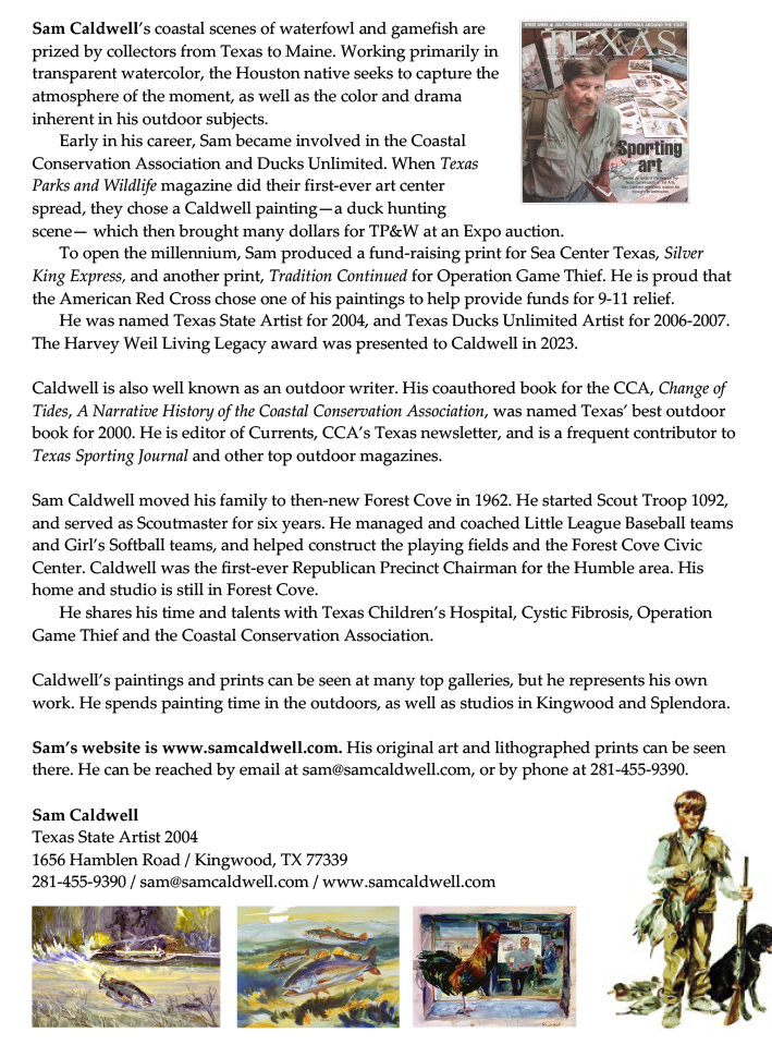 Sam Caldwell’s coastal scenes of waterfowl, gamefish and people are prized by collectors from Texas to Scotland. Working in transparent oil and watercolor, the Houston native seeks to capture the atmosphere of the moment, as well as the color and drama inherent in his outdoor subjects. Many of his recent images feature young hunters and fishers. “Wildlife is primary in my work,” he says, but notes that “people are important elements of wildlife.”